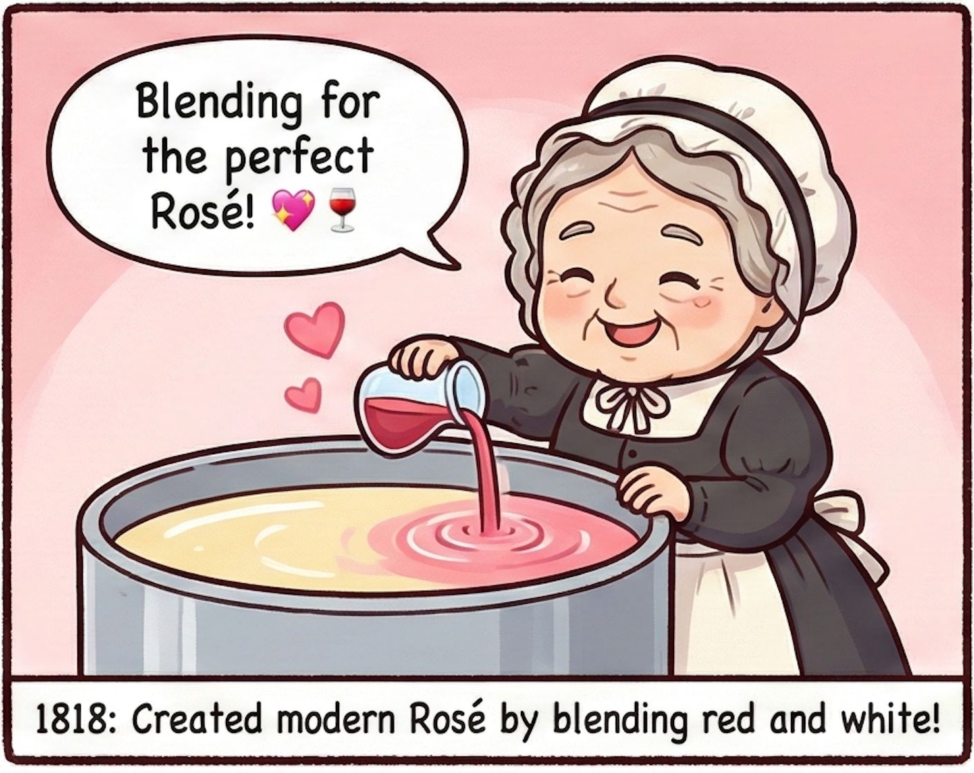 Prior to this, rosé champagne was made by staining white wine with elderberries. Finding this method crude, Madame Clicquot broke tradition again. She created the first Rosé d'assemblage (blended rosé) by blending her finest Bouzy red wines with her still white wines. This method created a rosé with better structure, flavor, and color stability, setting the modern standard for pink champagne.