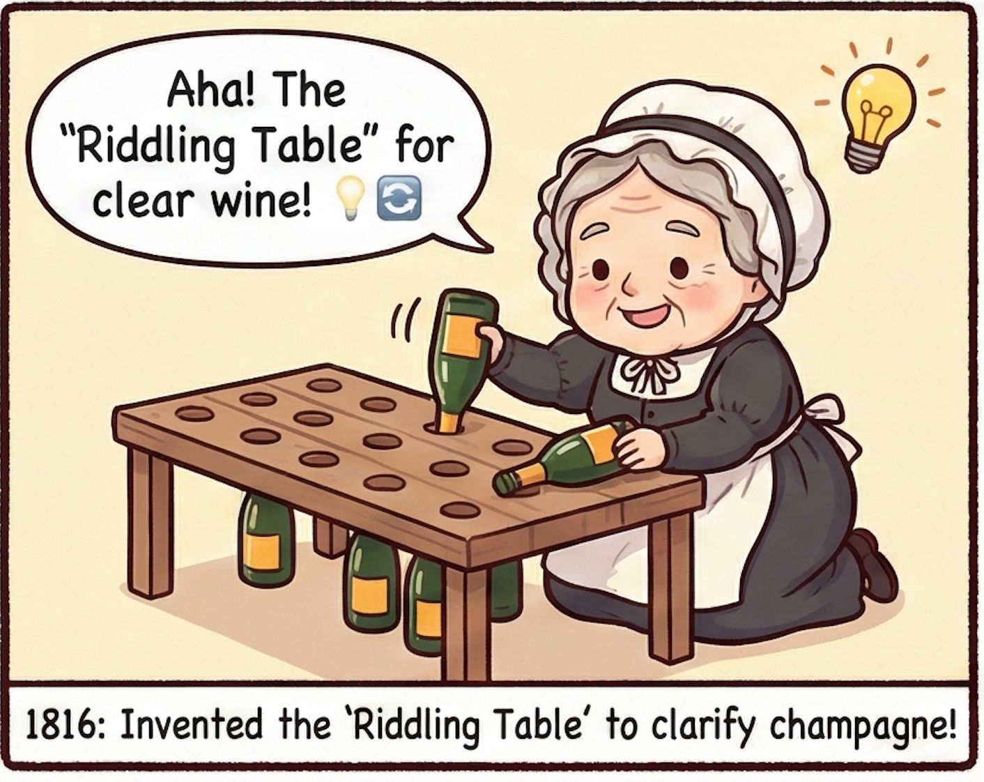 This is her greatest technical contribution. At the time, champagne was cloudy due to yeast sediment. Madame Clicquot invented the table de remuage (riddling table). By placing bottles upside down at an angle and rotating them slightly every day, the sediment settled in the neck for easy removal. This invention allowed for crystal-clear wine and is still the method used by every champagne house today.